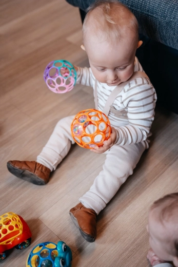 OBALL CLASSIC 10 cm je ikonična igrača z odprto mrežasto zasnovo iz zelo mehkega, upogljivega in praktično neuničljivega plastika. Zahvaljujoč 32 odprtinam se dojenčki zlahka naučijo žogico prijeti, tresti, kotaliti in podajati iz roke v roko – tako krepijo prste, dlani in koordinacijo oko‑roka. Lahka teža in prijetna tekstura vabita k igri doma, na trebuščku in na poti v vozičku.
