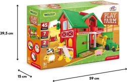 Igralni set Play House kmetija popelje otroke v realistično okolje posestva. Dvonadstropna hiša višine približno 37 cm ponuja veliko interaktivnih elementov: odpirajoča se vrata, dvigalo, žerjav in rampe. Del kompleta sta tudi traktor s prikolico, figurice domačih živali (konj, petelin, kokoš, krava, prašič, ovca) ter nalepke za dodelavo podrobnosti.