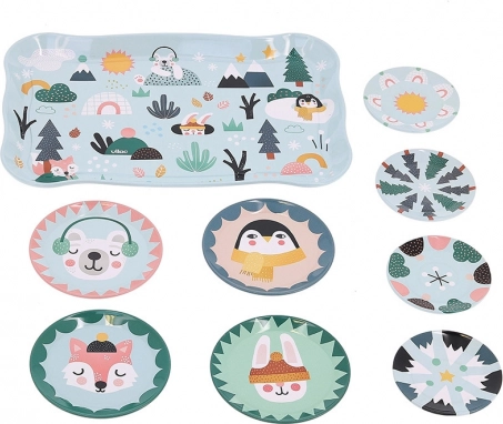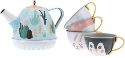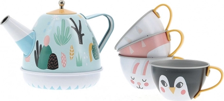 Ta kakovosten kovinski čajni set bo navdušil vse male gostitelje in gostiteljice. V notranjosti čajnika je skrit navijalni glasbeni mehanizem, ki se ob nagibu oglasi s prijetno melodijo in vsako postrežbo čaja spremeni v majhen obred. Pastelne barve, ljubki živalski motivi in čiste linije naredijo set za čudovito darilo in stilni dodatek otroški sobi.
