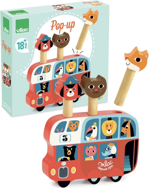Vilac Lesena izstrelitvena igra Avtobus z živalmi je čudovita igrača z ilustracijami znane umetnice Ingele P. Arrhenius. Tri ljubke figurice – lisica, kuža in mačka – izskočijo iz avtobusa, kar zagotovo zabava otroke.