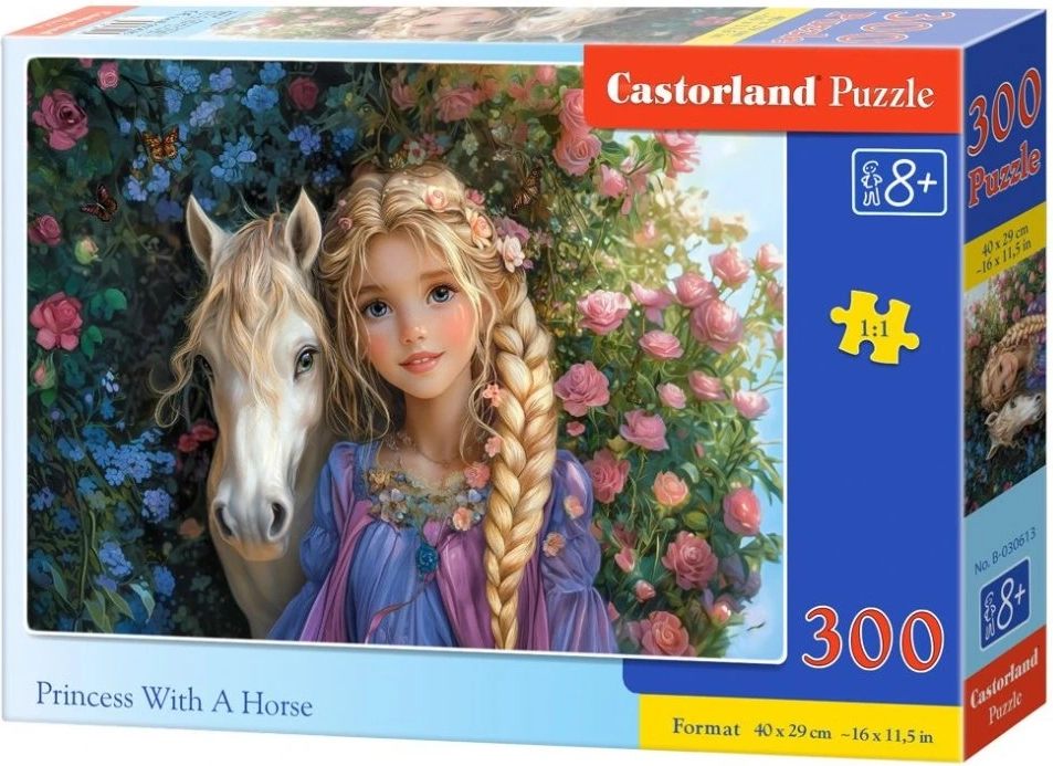 Odkrijte čar pravljičnega sveta s sestavljanko CASTORLAND. Sestavljanka z motivom princese in konja ponuja 300 koščkov za prijetne družinske trenutke in vadbo potrpežljivosti. Po sestavljanju ima sestavljanka dimenzije približno 40 × 29 cm – idealna velikost za uokvirjanje ali razstavitev v otroški sobi.