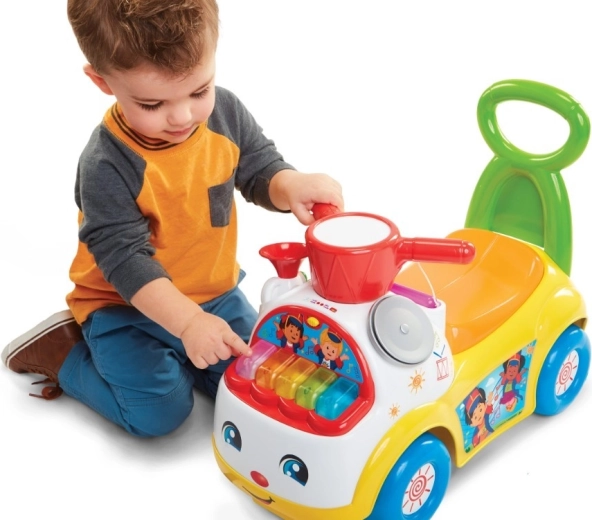 Boben, činela, paličica in odstranljiva trobenta učijo otroke odkrivati zvoke in ritem. Poleg tega navdušijo tudi zabavni zvoki vozila, na primer zagon motorja.