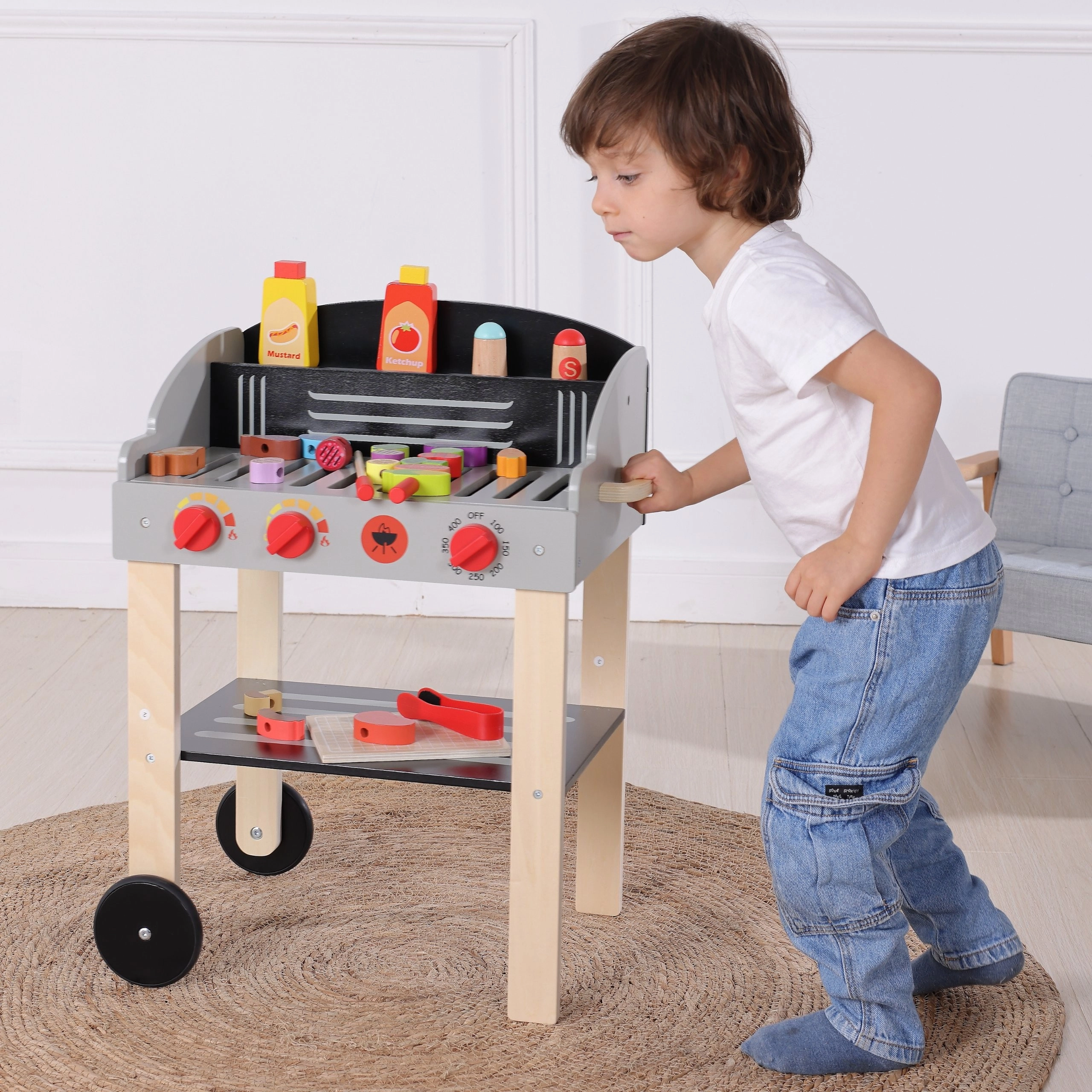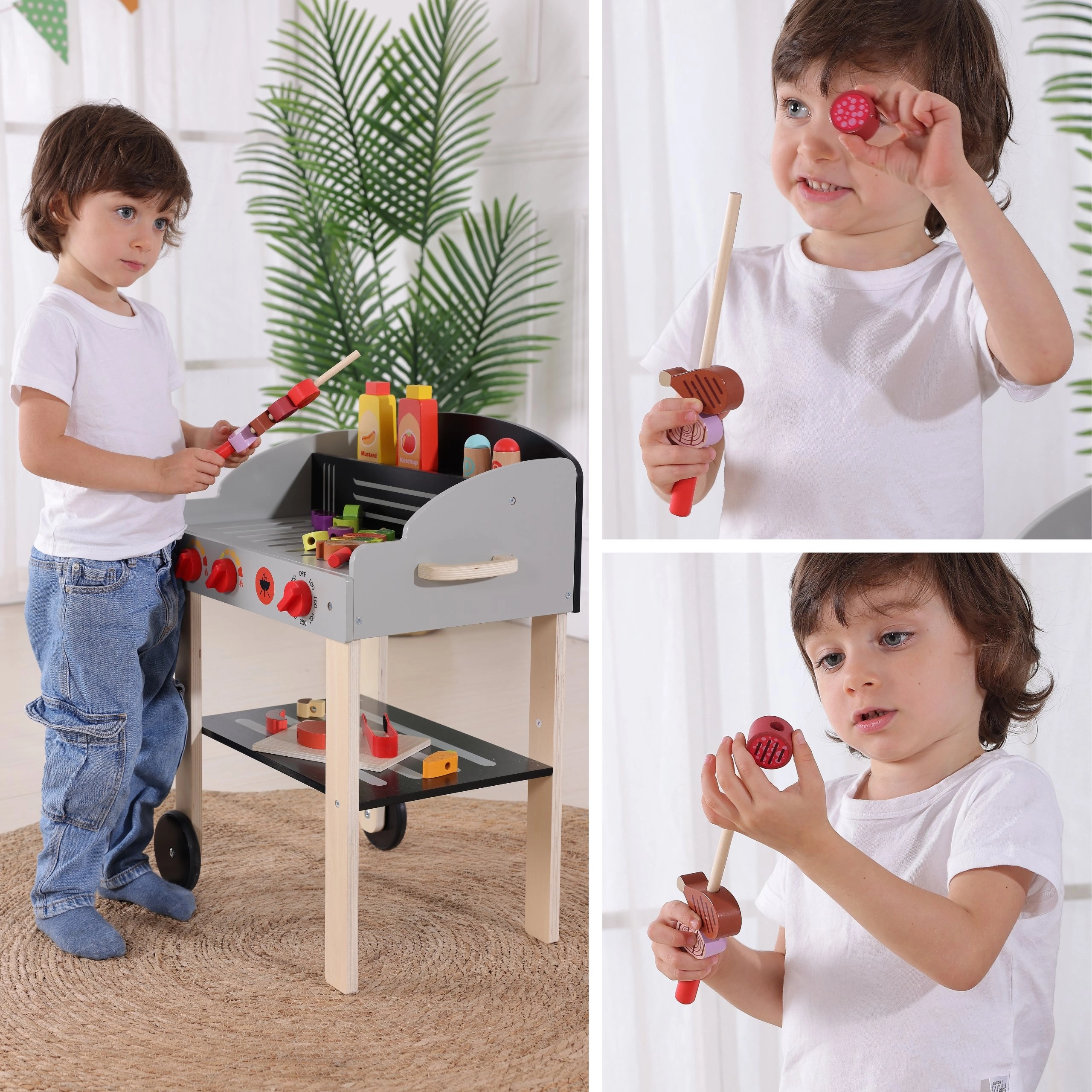 Realistični klikajoči gumbi in odpirljiv pokrov prinašajo avtentično izkušnjo žarjenja. Dve nabodali si otroci sestavijo iz lesenih koščkov “mesa”, zelenjave in gob, vse dopolnijo s začimbami in omakami ter obračajo s pomočjo žar klešč. Komplet spodbuja domišljijo, igro vlog in sodelovanje s prijatelji.