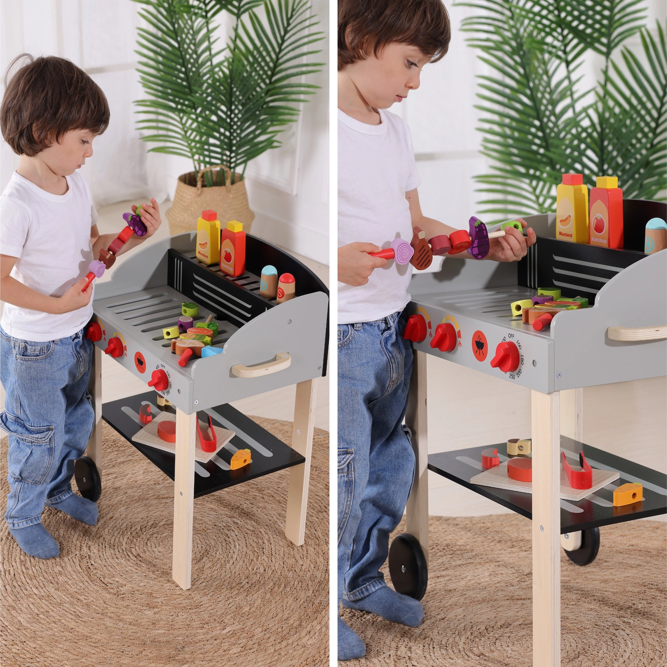 Odkrijte veselje igre kuharja s čudovitim lesenim žarom WOOPIE na kolescih. Ta kakovosten komplet iz trdnega lesa z vrtljivimi gumbi, odpirljivim pokrovom in spodnjo polico navduši otroke od 3 let dalje. Bogat komplet dodatkov, vključno z nabodali, zelenjavo in mesom, kečapom in gorčico, solnico in popernico ter kleščami, podpira kreativno igro, razvoj fine motorike in varno spoznavanje s pripravo jedi.