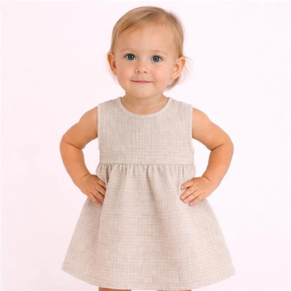 Obleka ima sodoben kroj v obliki črke A, je brez rokavov, spodnji del pa tvori čudovito nabrano krilce. Zapenjanje na gumbek na hrbtu olajša previjanje in preoblačenje. Muslin je poleg tega trpežen in z vsakim pranjem še mehkejši.