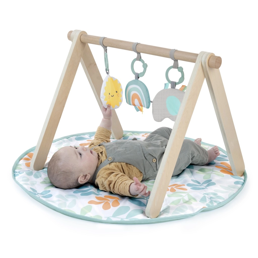Ustvarite dojenčku miren kotiček za igro in počitek. Leseno igralno stojalo z A-okvirjem zagotavlja stabilnost, medtem ko okrogla, mehko podložena podloga z listnim vzorcem nudi udobje za igro na hrbtu in za čas na trebuščku. Odstranljive igrače na obročkih zlahka premikate, da je igra vedno spodbudna.