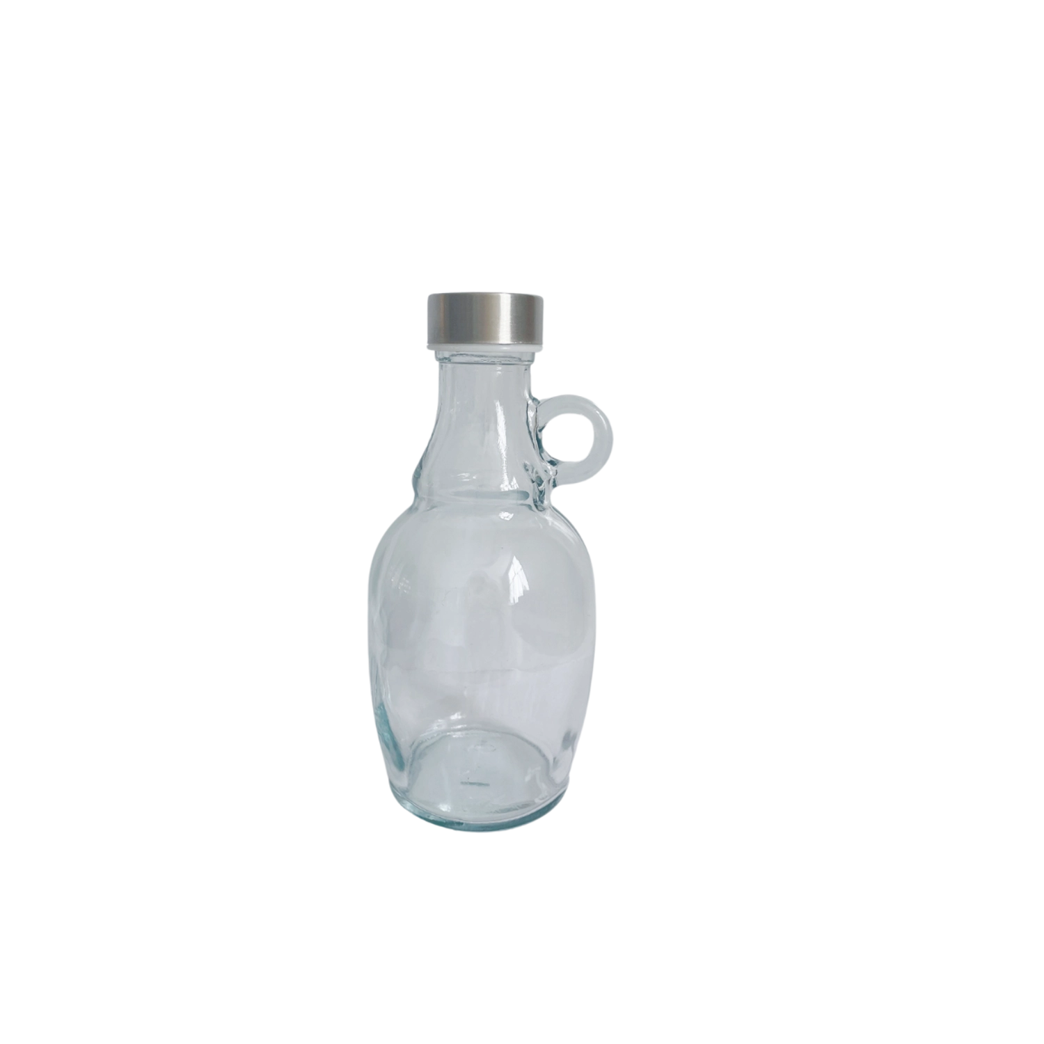 Steklena steklenička z ročajem 500 ml GALON je zanesljiva in estetska rešitev za shranjevanje domačih pijač. Prosojno steklo poudari barvo in bistrino pijače, medtem ko kakovosten navojni zamašek ščiti pred zrakom in nečistočami. Zahvaljujoč ergonomskemu ročaju je rokovanje pri točenju in prenašanju udobno.