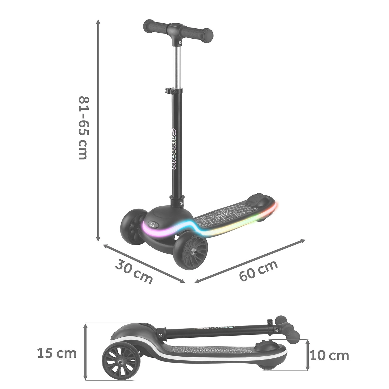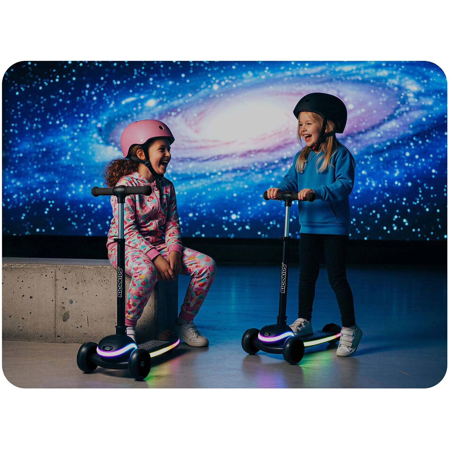 Ricokids Leddi združuje sodoben dizajn, kakovostno izdelavo in varnost. Dve sprednji kolesi povečujeta stabilnost, protizdrsni podest in ročaji zagotavljajo zanesčen oprijem, nožna zavora pa olajša nadzor hitrosti. Osvetljen podest z 20 načini ponuja enobarvne in večbarvne učinke ter gladke prehode – idealno za vidnost in zabavo.