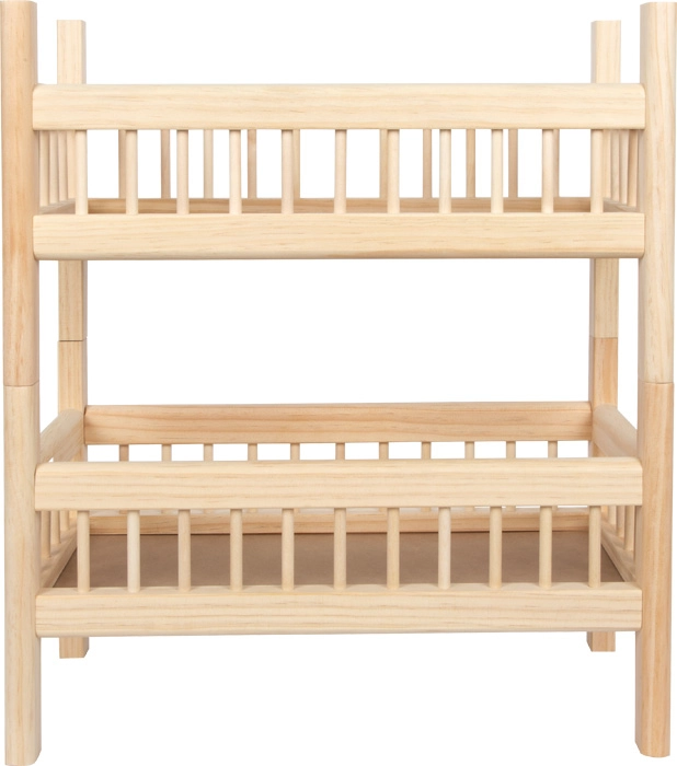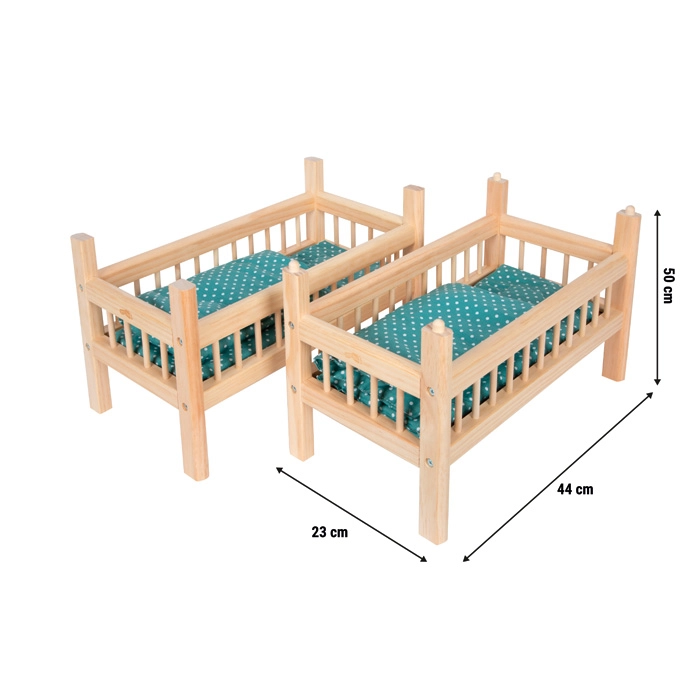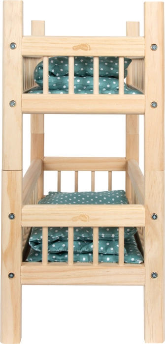 Privoščite punčkam in plišastim igračam udoben spanec v modni posteljici 2 v 1. Ta robustna postelja iz naravnega lesa se zlahka uporabi kot pograd ali razdeli na dve samostojni postelji. Ima zaobljene robove za varno igro, primerna je za igrače do 39 cm in vključuje celoten komplet posteljnine v ljubkem pikčastem dizajnu.