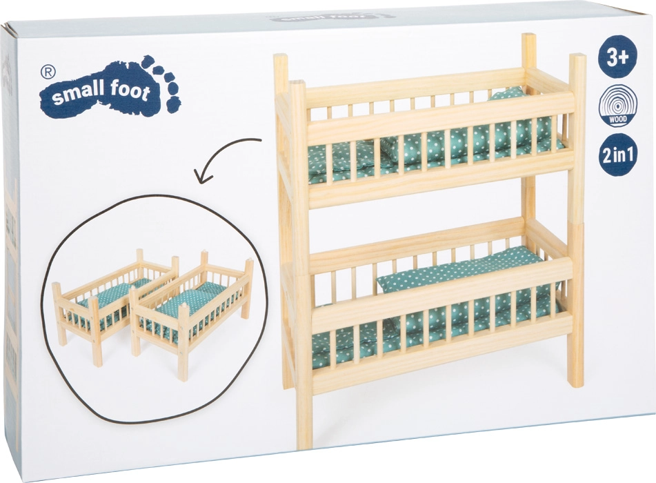 Univerzalna lesena posteljica za punčke SMALL FOOT je idealna izbira za ustvarjalno otroško igro. Zaradi kakovostne izdelave in naravnega videza se odlično poda v vsako otroško sobo. Koncept 2 v 1 omogoča uporabo kot pograd za dvojno mero zabave ali razdelitev na dve postelji za igro z več punčkami hkrati.