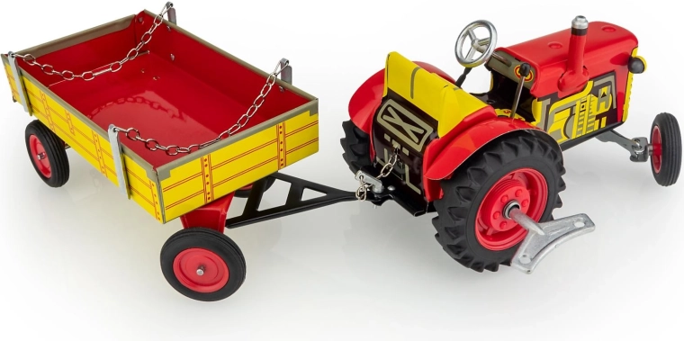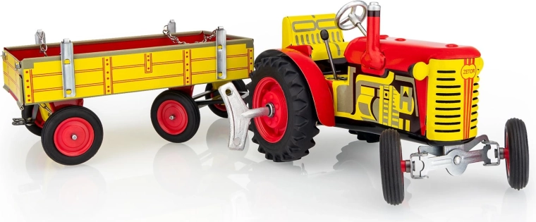 Kovinski model traktorja ZETOR s prikolico znamke KOVAP bo navdušil male in velike ljubitelje tehnike. Pogon zagotavlja vzmetni mehanizem na ključek, ne manjka niti funkcionalen menjalnik s tremi prestavami naprej in vzvratno, krmiljenje z volanom ter ročna zavora. Merilo 1:25, dolžina približno 28 cm.