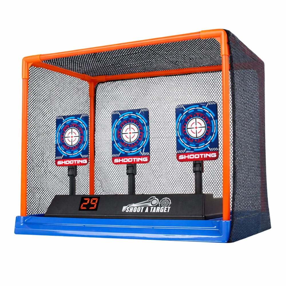 Zabavna elektronska tarča za streljanje za otroke in najstnike prinaša akcijsko igro in trening natančnosti doma in na prostem. Tri premične tarče po zadetku padejo, sistem pa jih samodejno dvigne, zato igra nemoteno poteka. Digitalni števec točk spremlja rezultate, svetlobni in zvočni učinki (vključno z aplavzom po seriji zadetkov) pa stopnjujejo vzdušje. Praktična zaščitna mreža ujame penaste naboje in olajša pospravljanje.