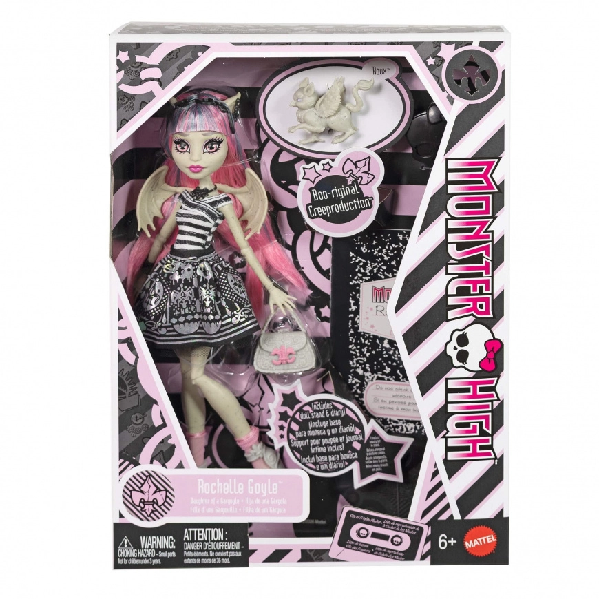 Vrnite se v svet Monster High z vrnitvijo kultnega lika Rochelle Goyle. Lutka izstopa s črno-belim črtastim topom, kovinskim mini krilom in rožnatimi poudarki, ki se ujemajo z njenimi dolgimi rožnatimi lasmi. Dovršeno ličenje, dodatki in ikonična krila ustvarjajo edinstven »scarisovski« slog.