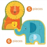 Predstavljamo Petit Collage Prve Uganke Mladički Safari, idealno izbiro za male raziskovalce od 2. leta starosti. Ta set vsebuje štiri živalice, ki jih bo vaš otrok postopoma odkrival v obliki manj ali bolj zahtevnega sestavljanja s 3 do 6 deli.