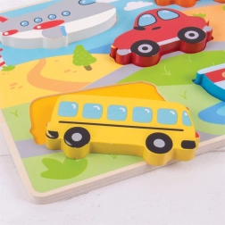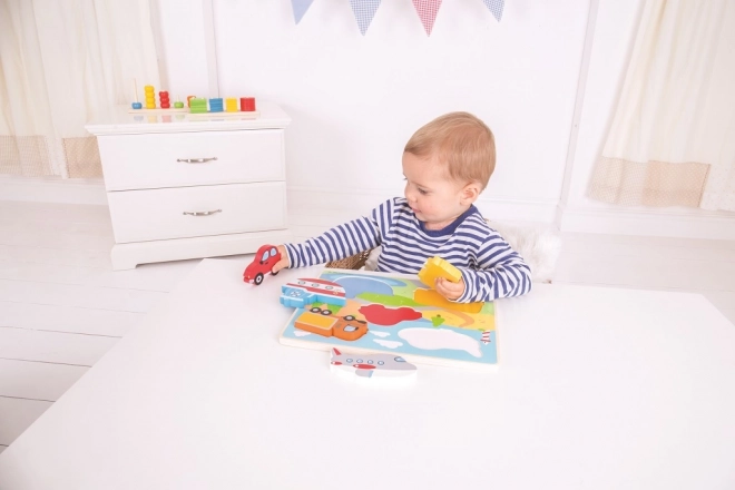 Odkrijte svet prometa na igriv način. Lesene vstavljanke z motivi letala, avtomobila, avtobusa, tovornjaka in ladje spodbujajo otroke k prepoznavanju oblik in barv ter hkrati razvijajo njihov besedni zaklad. Deli so dovolj veliki in prijetni za otroško roko.