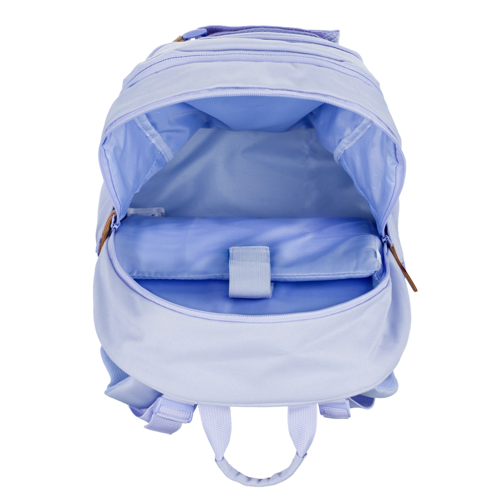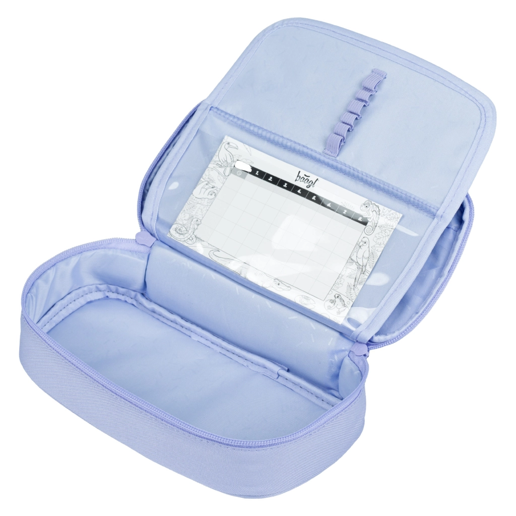 Set dopolnjuje trdna peresnica z izklopno pregrado, žepom na zadrgo in mestom za urnik, praktična vrečka za copate ali športne stvari z zatezanjem na vrvice, moderna ledvička z dvostransko nastavljivim trakom in kakovostno dvosmerno zadrgo ter zaščitni ovitek za prenosnik do 15". Vse v enotnem, elegantnem lila dizajnu.