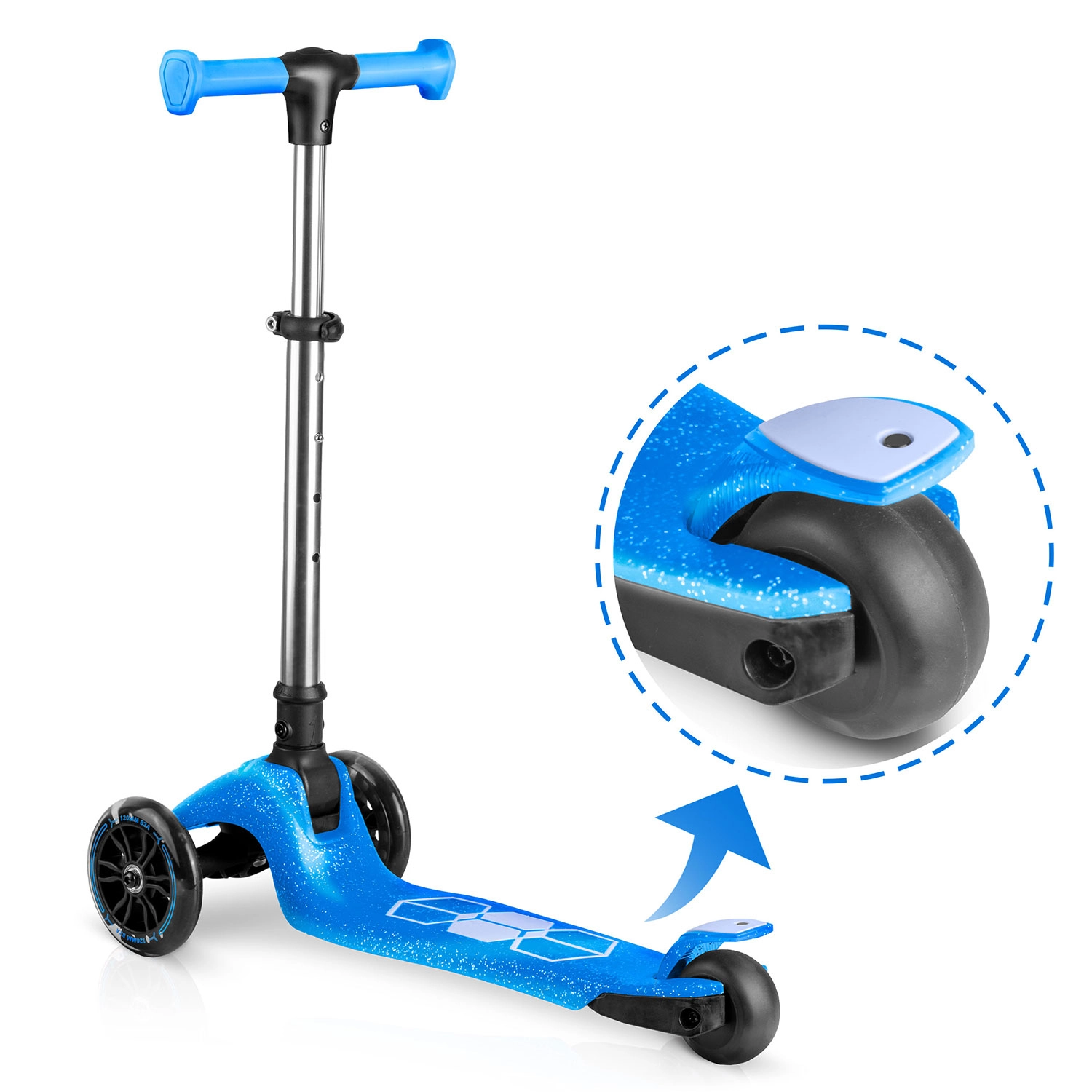 Tristopenjska nastavitev višine se prilagodi otrokovi rasti. Zadnja nožna zavora zagotavlja gladko in zanesljivo ustavljanje.