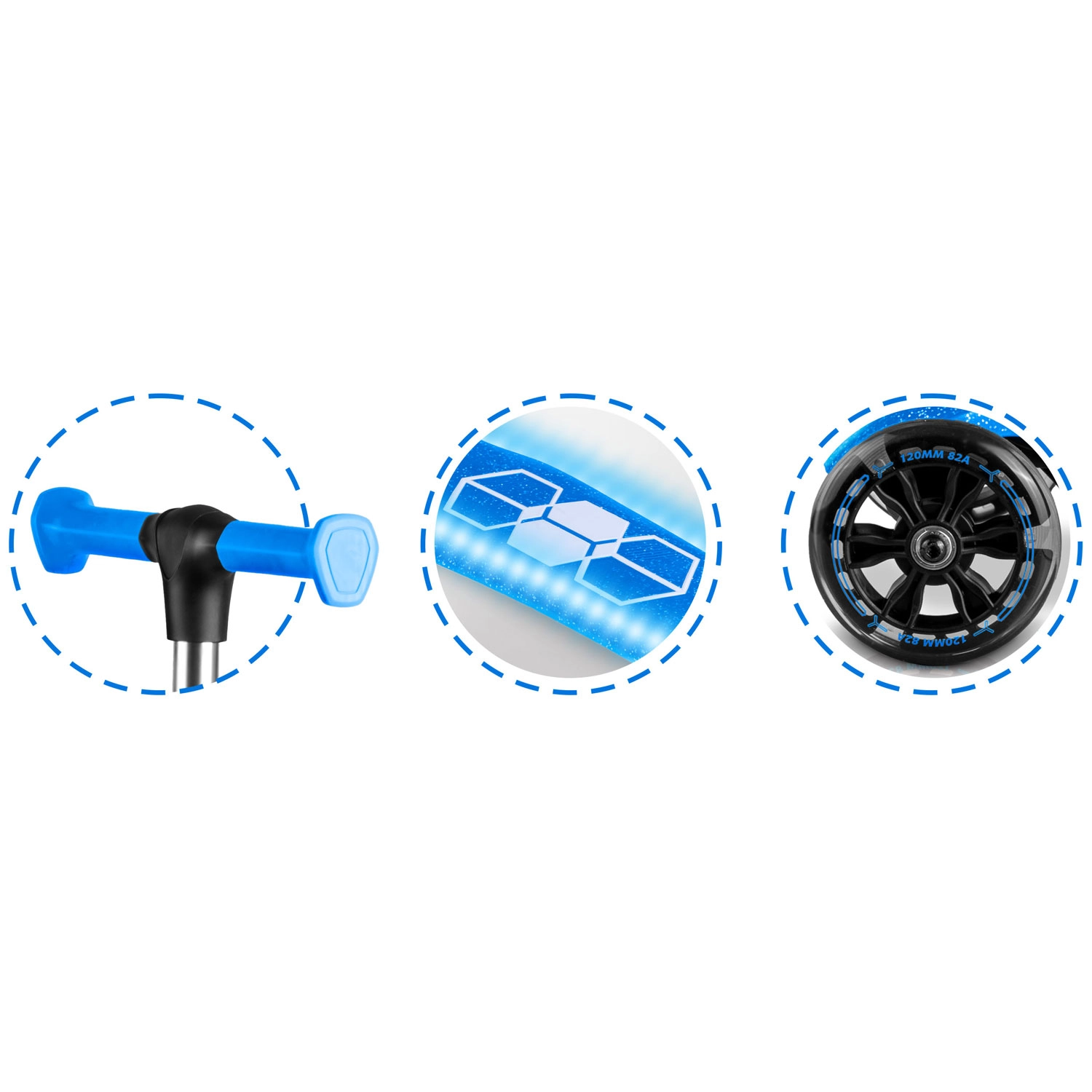 Vgrajena LED osvetlitev v podestu in svetleča sprednja kolesca z dinamo popestrita vsako vožnjo in povečata vidnost v mraku. Nastavljivo aluminijasto krmilo zlahka raste z otrokom, zato bo skiro služil več sezon. Robustna konstrukcija je zasnovana za vsakodnevno uporabo in izpolnjuje certifikat CE ter EN71-1/2/3.