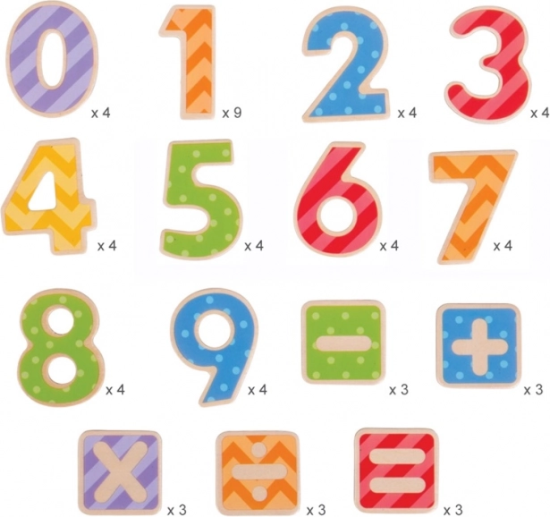 V tem kompletu najdete skupno 56 kosov, ki vključujejo številke od 0 do 9 in različne matematične operatorje. Magnetne številke so odličen pripomoček za table, kar otrokom omogoča preprosto ustvarjanje računov in številskih zgodb. Pomagajo razvijati spretnost in koncentracijo, njihova uporaba pa je varna.