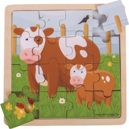 Skrbna kravica s svojim teličkom vabi otroke na zeleni travnik – čaka jih sproščeno sestavljanje, ki spodbuja fino motoriko in potrpežljivost. Deli so trdni, gladko obdelani in prilagojeni malim rokam, zato so enostavni za rokovanje. Zaradi formata 18 × 18 × 1 cm so puzzle primerne za dom in za na pot.
