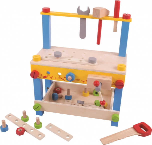 Odkrijte prvo delavnico za male mojstre – robustna lesena klop s 26 deli, ki spodbuja fino motoriko, koordinacijo roka–oko in kreativno igro. Vključena so otroška orodja, kot so kladivo, žaga, ključ, izvijač, vijaki in matice. Izdelano iz kakovostnega lesa, izpolnjuje evropske varnostne standarde.