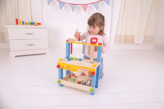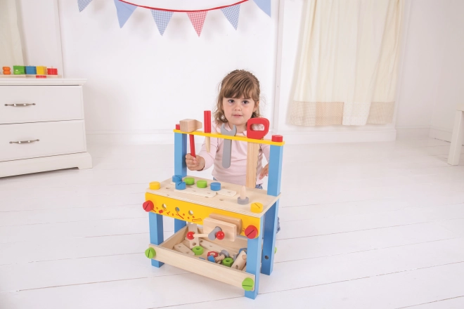 Ta barvita lesena delovna miza BIGJIGS TOYS je odličen začetek v svet orodja. Z realističnimi elementi in varnim lesenim orodjem si otroci vadijo praktične spretnosti ter se učijo osnovnih načel dela z orodjem – na igriv in varen način.