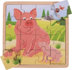 Prvi skupni sprehod pujska in pujskota na ljubki ilustraciji otroke pritegne na prvi pogled. Puzzle s 16 kosi so vstavljene v okvir s podlagnim motivom, zato se mali začetniki hitro znajdejo in uživajo v uspehu. Kosi so dovolj veliki in prijetni za otroško dlan.
