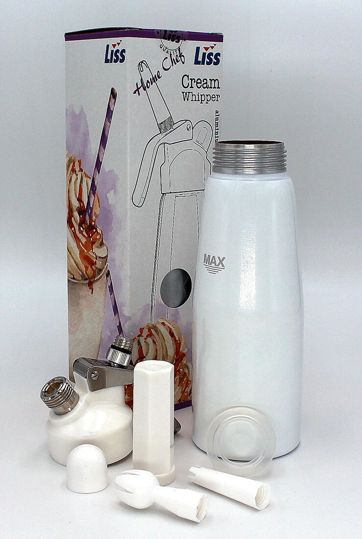 Praktična in elegantna steklenica za smetano s prostornino 0,5 l za domačo pripravo rahle stepene smetane. Zahvaljujoč aluminijastemu ohišju z belim lakom ter kakovostni glavi iz plastike, jekla in silikona je idealna za vsakodnevno uporabo. Združljivost z običajnimi bombicami zagotavlja enostavno uporabo in odlične rezultate. Hitra priprava, preprosto upravljanje in zanesljiva kakovost LISS za popolno smetano kavi in sladicam.