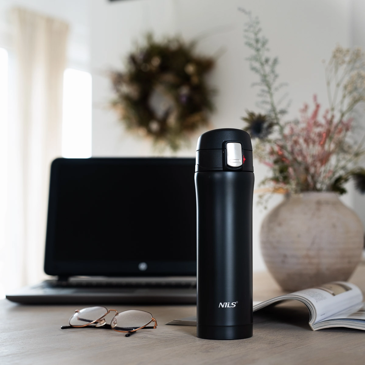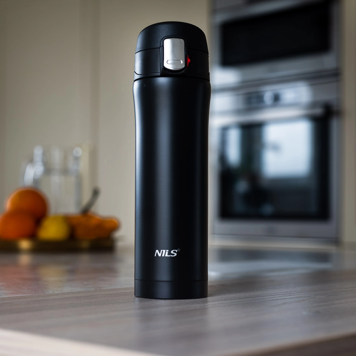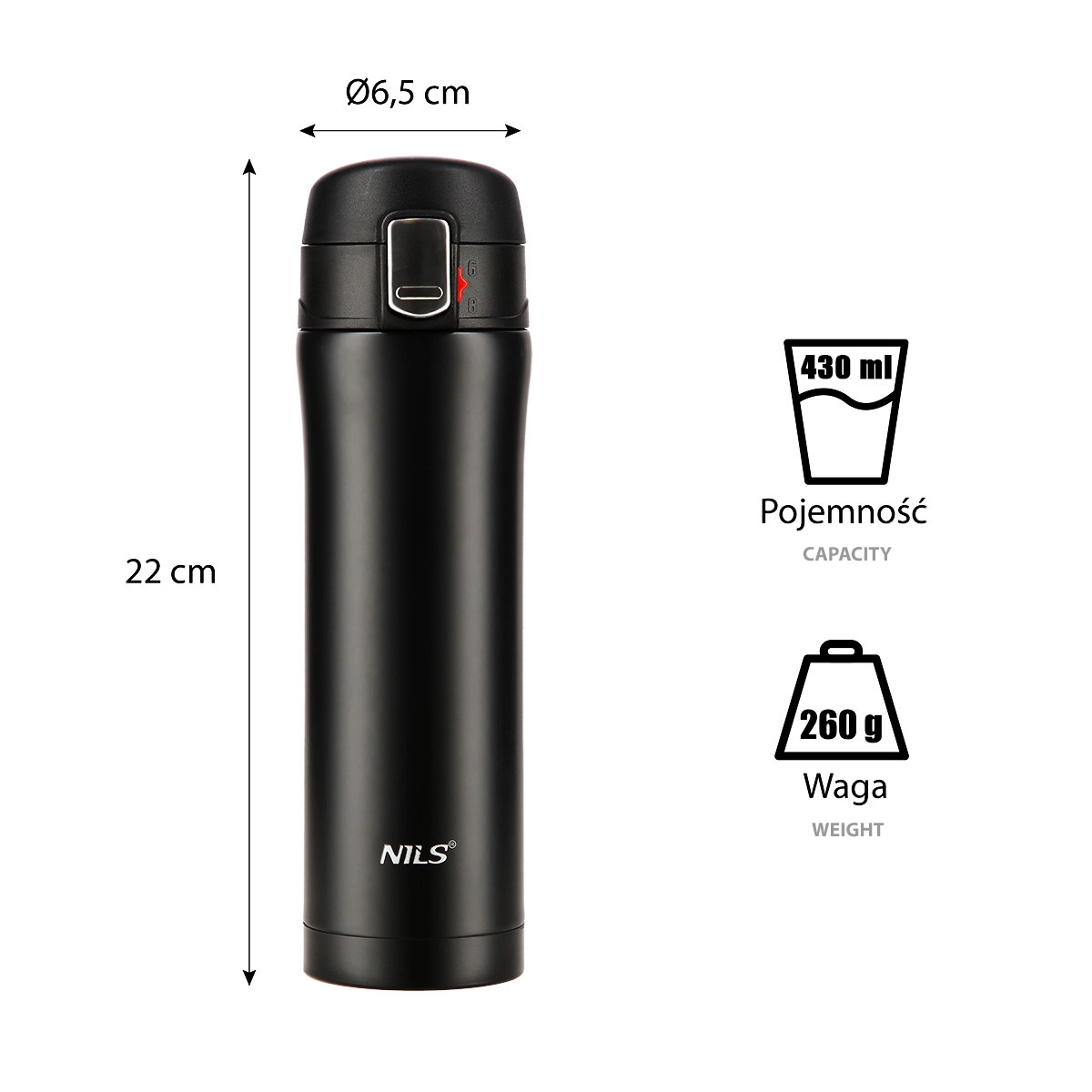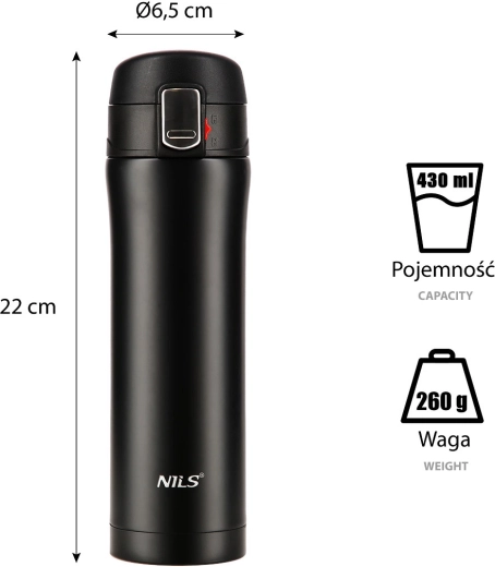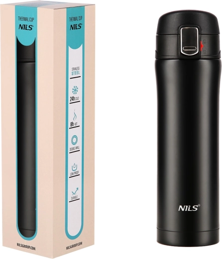 Elegantna potovalna termovka NILS Camp s prostornino 430 ml iz trpežnega nerjavečega jekla z dvojno vakuumsko steno ohranja napitke tople do 12 ur in hladne do 24 ur. Praktičen pokrov s ključavnico in gumbom za enostavno odpiranje preprečuje razlitje, zato je idealna za pisarno, avto in izlete.