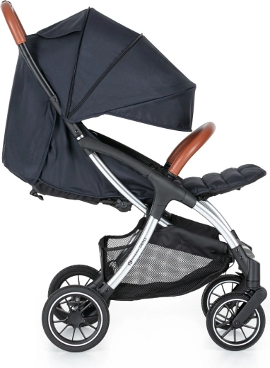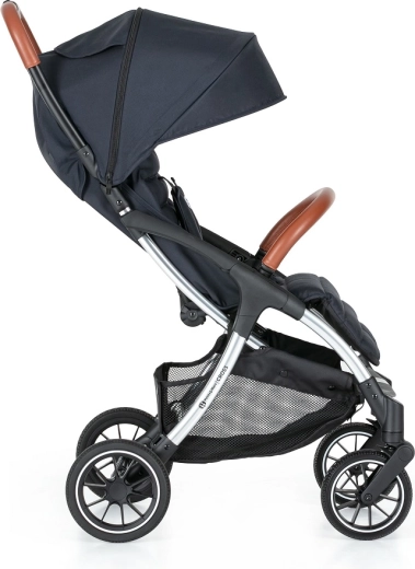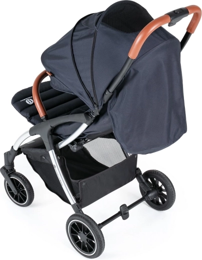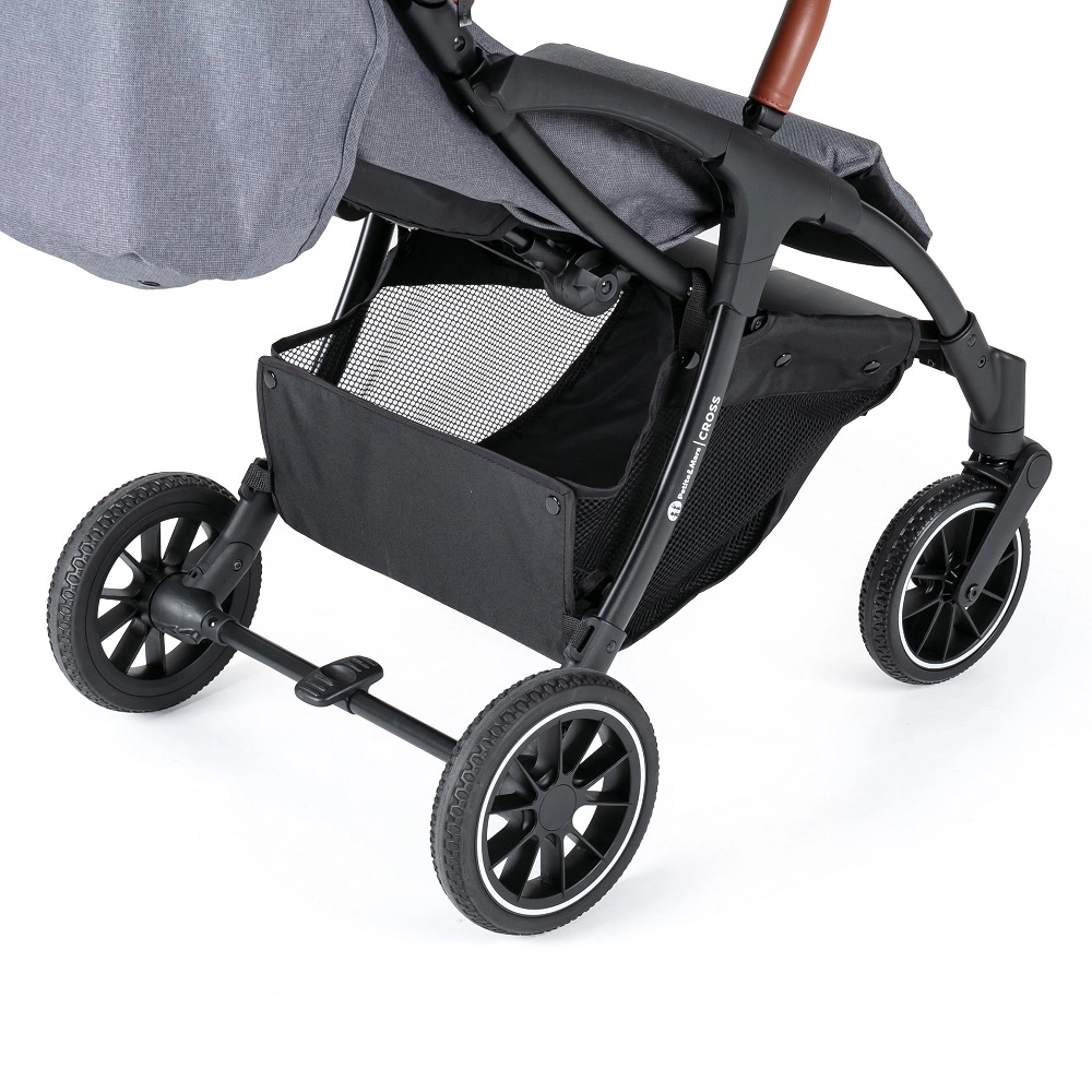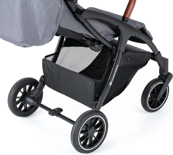 Voziček upravljate z eno roko, ima popolnoma vrtljiva sprednja kolesca in centralno nožno zavoro za varno ustavljanje. Velika kolesa z vzmetenjem (20% guma, 80% EVA) izravnajo neravnine in olajšajo vožnjo. Praktična spodnja košara z nosilnostjo 3 kg in odličnim dostopom sprejme vse potrebno na poti.