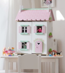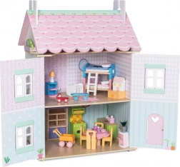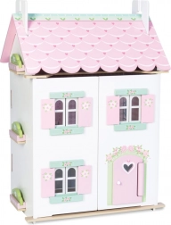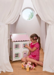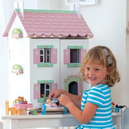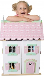 Hiška za punčke Sweetheart Cottage očara z detajli – srčki in cvetličnimi motivi, pastelnimi toni ter premišljenim razporedom prostorov. Sprednji del se povsem odpre, zato imajo otroci udoben dostop do vseh sob, z dvigom dela strehe pa odkrijejo prijetno mansardo.