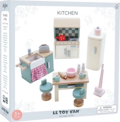 Set vsebuje pomivalno korito, štedilnik, pečico z odpirajočimi vrati, velik hladilnik, mizo z dvema stoloma in skupaj 20 delov.