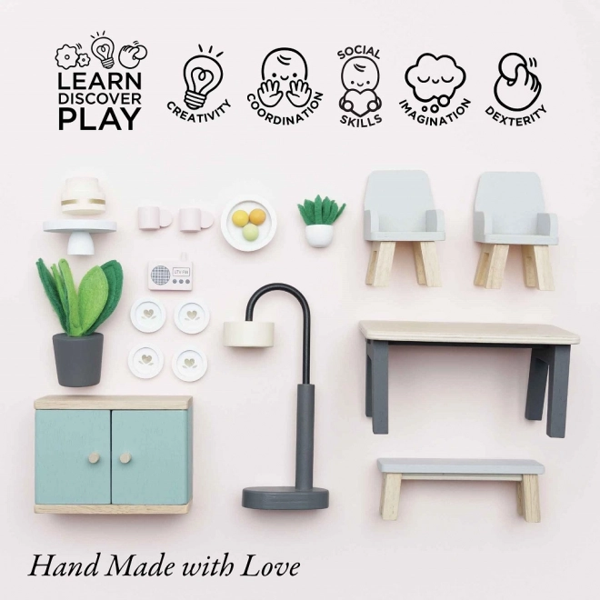 Ta čaroben jedilni komplet je narejen iz kakovostnega lesa s certifikatom FSC in prinaša pridih sofisticiranosti v vsako hiško za punčke. Vsebuje 18 elementov, vključno z mizo, dvema foteljema, klopjo, svetilko, omarico in dekorativnimi dodatki, kot so rastline, skleda s sadjem in torta. Ta komplet ne samo da izgleda čudovito, ampak tudi podpira kognitivne in komunikacijske sposobnosti otrok. Je dekoriran z netoksičnimi barvami na vodni osnovi in je združljiv z drugimi hiškami Le Toy Van Dolls.