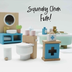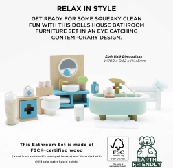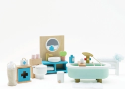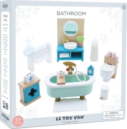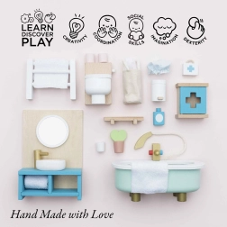 Stilski komplet kopalniškega pohištva za hišico za punčke v merilu 1:12 znamke LE TOY VAN. Vsebuje kad, stranišče, umivalnik, obešalnik za brisače in omarico z zdravili, ročno dodelan z net strupenimi barvami na vodni osnovi. Izdelano etično iz trajnostnih materialov, spodbuja kreativno igro, komunikacijske veščine in koordinacijo.