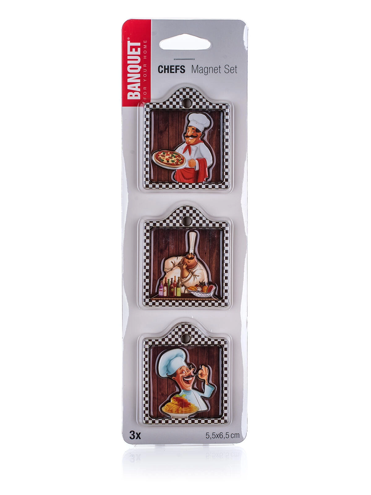 Stilski komplet treh magnetkov z motivom Chefs bo okrasil vaš hladilnik in hkrati ponudil praktično uporabo – pripenjanje receptov, seznamov ali sporočil. V univerzalni mešanici dekorjev se zlahka poda k vsakemu slogu kuhinje.