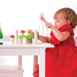 Igrača razvija motorične spretnosti, saj otroci uporabljajo kladivce za zabijanje mušic. Barvite zasnove in oblike spodbujajo vizualno zaznavanje.