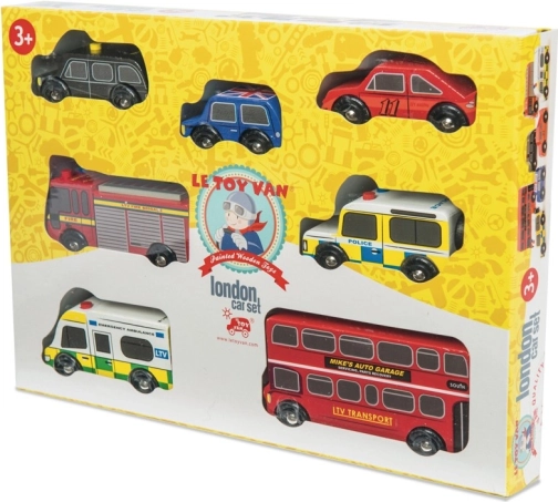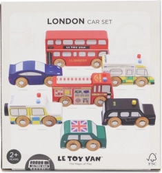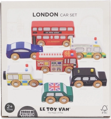 Odkrijte svet živahnih londonskih ulic s podrobno izdelanimi lesenimi vozili Le Toy Van. Komplet vključuje dvonadstropni avtobus, črni taksi, gasilski avto, reševalno vozilo, policijski avto in dva osebna avtomobila. Robustna izvedba iz trajnostnega kavčukovega lesa ter gladki robovi so idealni za male otroške roke, ki pri igri urijo prijem, koordinacijo roka–oko in domišljijo.