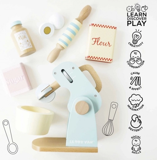 Stilski kuhinjski robot Le Toy Van otrokom prinaša pristno izkušnjo peke v njihovi otroški kuhinji. Z vrtljivo metlico, lesenim valjarjem in skledo si lahko »spečejo« torto, piškote ali kolač. Pastelne barve in retro dizajn so prava paša za oči, kakovostna lesena izvedba pa zagotavlja dolgo življenjsko dobo.