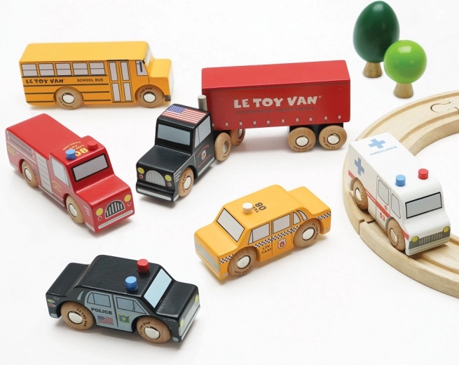 Šolski avtobus, gasilski avto, reševalno vozilo, policijski avto, taksi in zgibni tovornjak tvorijo pisan komplet, ki navdihuje zgodbe z živahnih mestnih ulic.