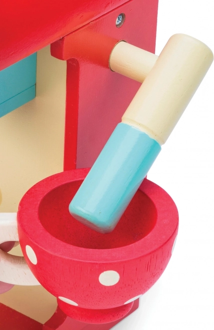 Vstavljajte lesene kapsule v ročico, »spuščajte« kavo v skodelico in se igrajte prave bariste. Interaktivni elementi spodbujajo domišljijo in fino motoriko.