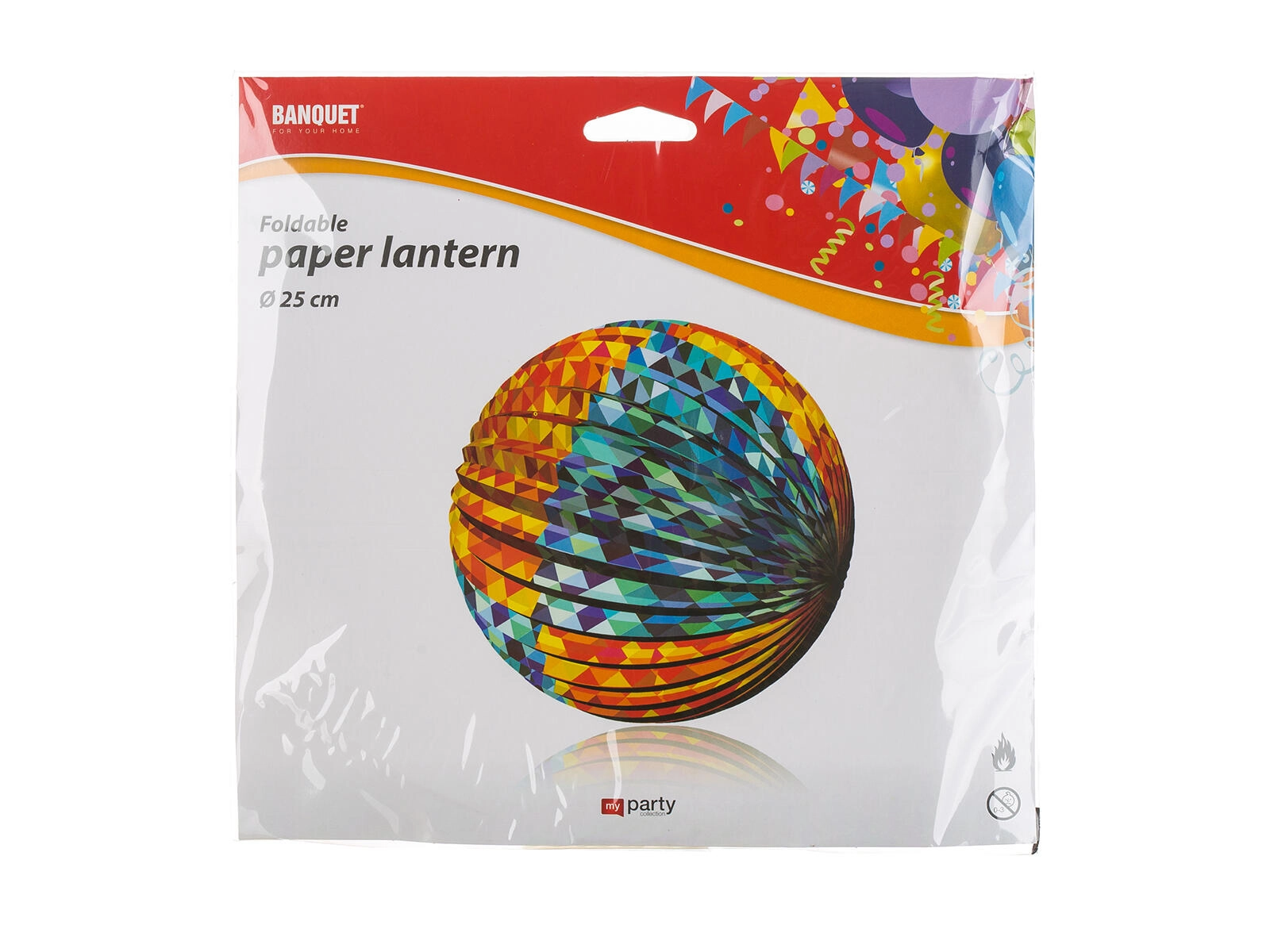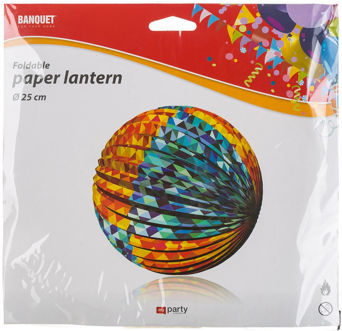 Okrasi zabavo, otroško sobo ali teraso s stilskim papirnatim lampijonom MY PARTY s premerom 25 cm. Lahek, zložljiv in enostaven za obešanje zahvaljujoč praktični sponki. Dva mešana dekorja z živahnim geometrijskim vzorcem takoj ustvarita veselo vzdušje. Namenjen izključno dekorativnim namenom – brez možnosti pritrditev svečke.