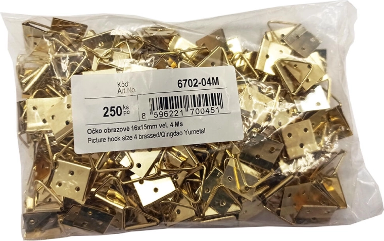 Praktično obešalno uho za zanesljivo obešanje okvirjev in fotografij. Dimenzije 16 × 15 mm, velikost 4, izdelano iz medenine za dolgo življenjsko dobo in eleganten videz. Pakiranje 250 kos je idealno za delavnice, okvirjarje in domačo uporabo. Enostavna montaža s pribijanjem na zadnjo stran lesenega okvirja.