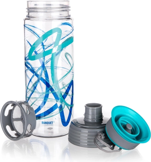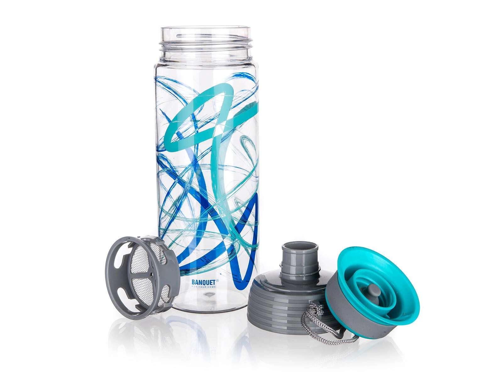 Vgrajeno nerjaveče cedilo 304 (18/8) zadrži sadje, zelišča ali čajne lističe in omogoča pripravo osvežilnih infused pijač brez neželenih koščkov med pitjem. Zahvaljujoč praktičnemu paščku jo zlahka prenašate, turkizni poudarki z potiskom pa steklenici dodajo svež videz.
