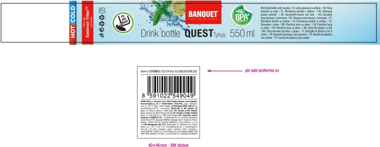Uživajte v čistem okusu pijače brez vonjav in priokusov zahvaljujoč vrhunskemu materialu TRITAN, ki je lahek, izjemno odporen in primeren za hladne in vroče napitke. Steklenica BANQUET QUEST s prostornino 550 ml ima širok vrat za enostavno polnjenje in čiščenje ter zanesljiv pokrov proti iztekanju – idealno na poti, v šoli, v pisarni in na treningu.