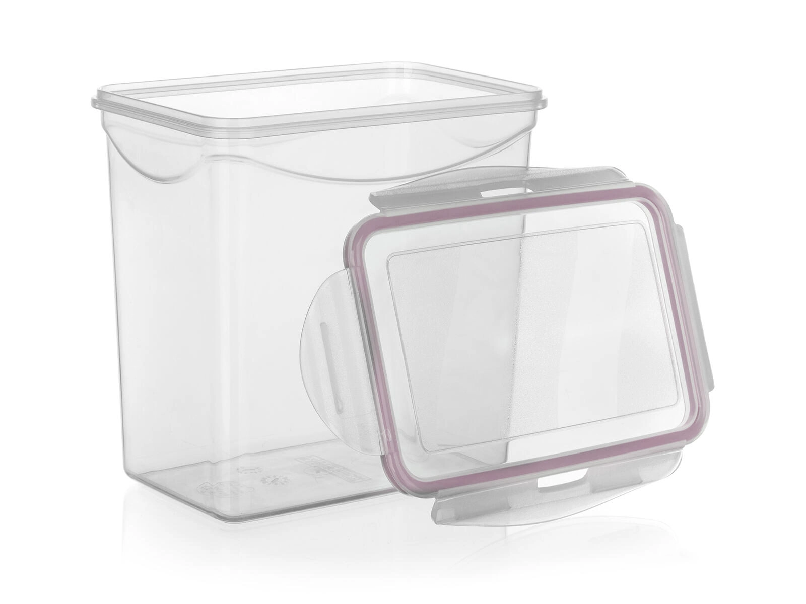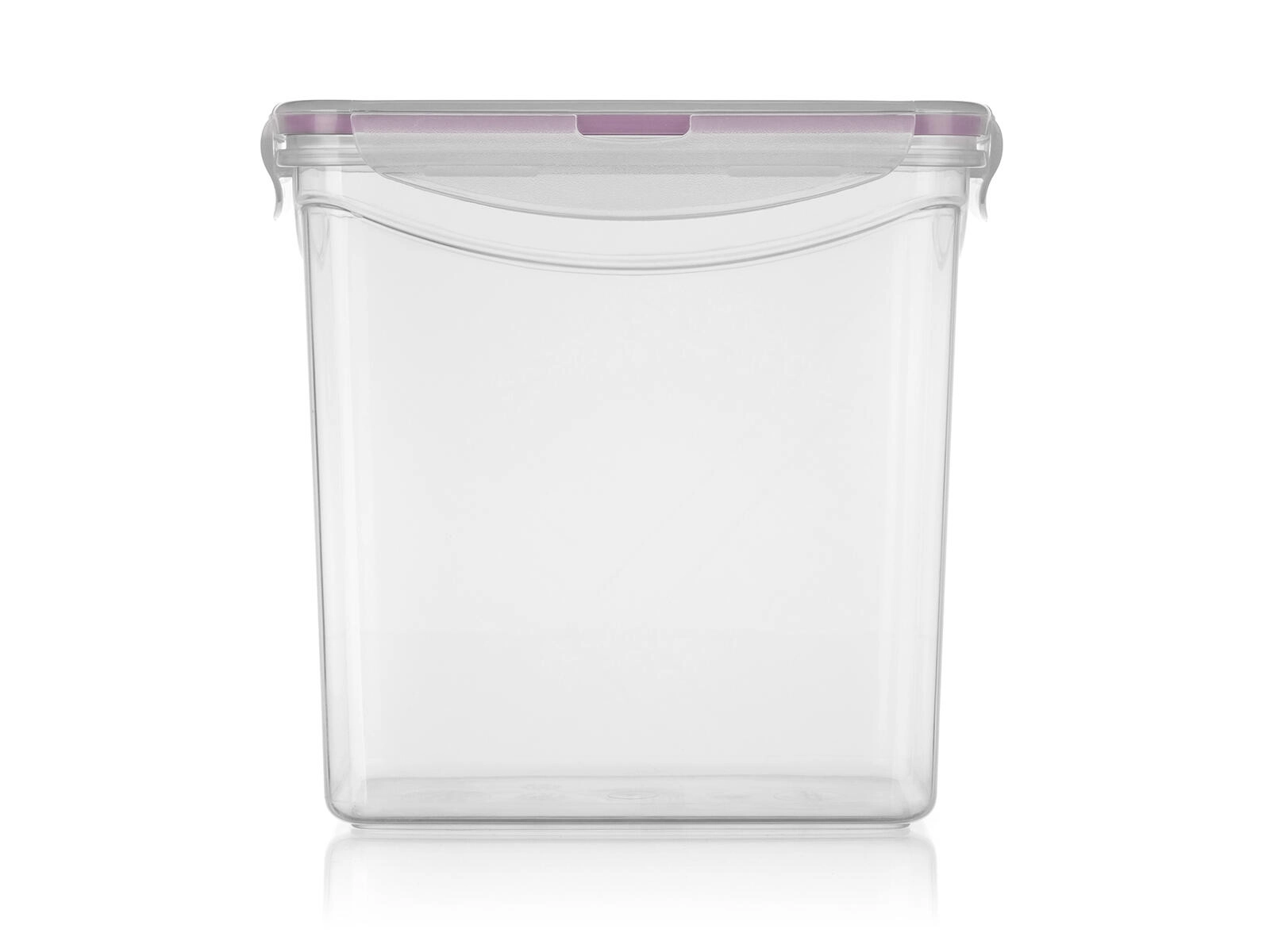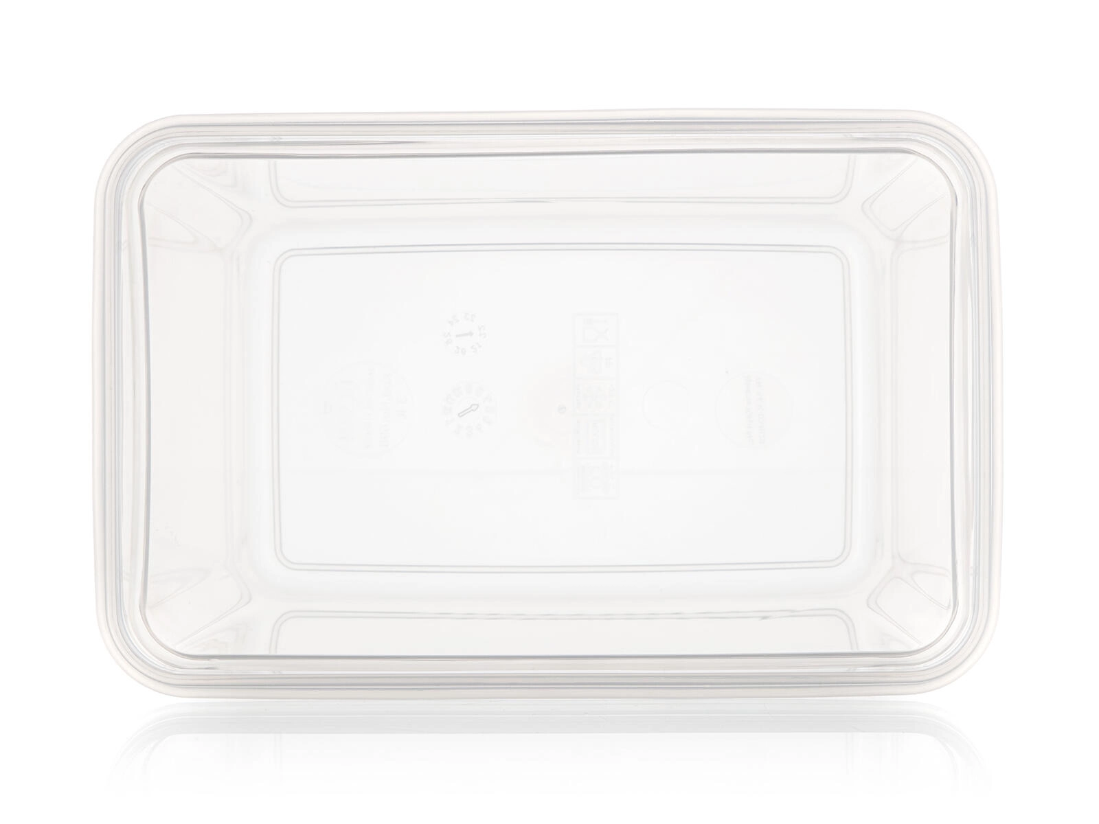 Prozorne stene omogočajo takojšen vpogled v vsebino, pravokotna oblika pa prihrani prostor v hladilniku in zamrzovalniku.