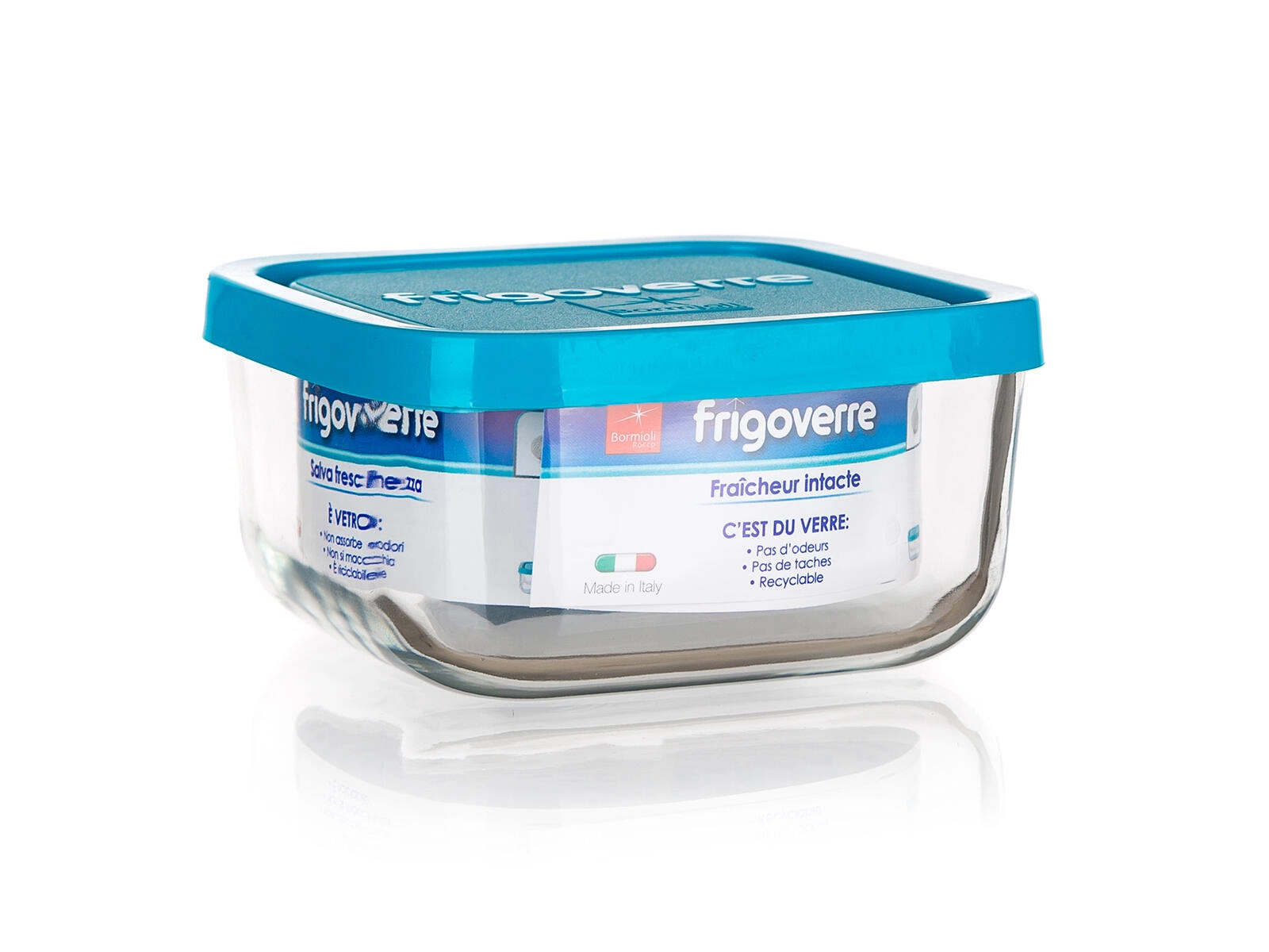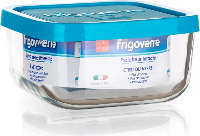 Posoda FRIGOVERRE združuje kakovostno steklo z močnim polipropilenskim pokrovom v modri barvi. Kvadratna oblika z merami 19 × 19 × 8 cm prihrani prostor v hladilniku in shrambi, prostornina 2 litra pa je odlična za gotove jedi, solate, sestavine ali ostanke večerje.