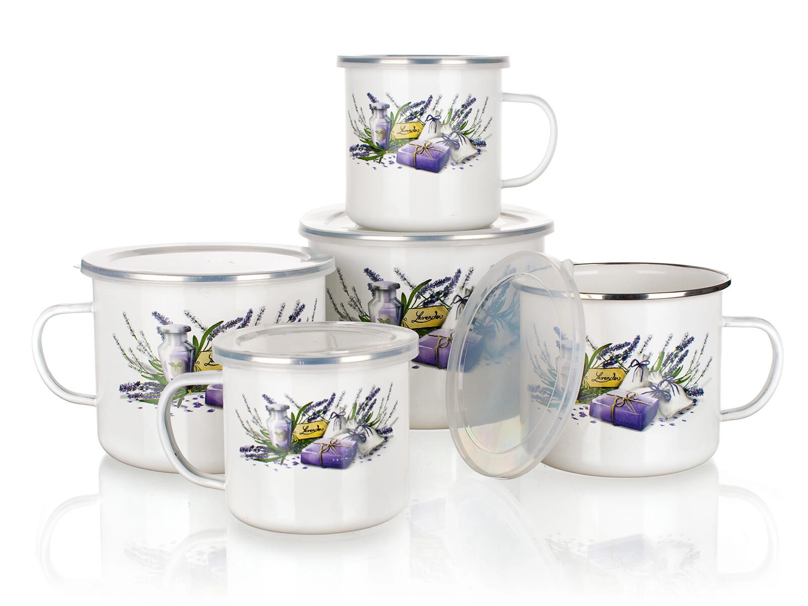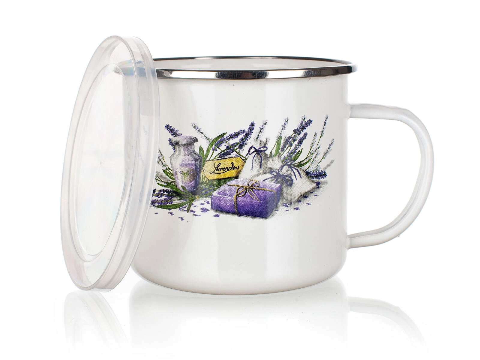 Emajl je znan po svoji odpornosti proti praskam in enostavnem vzdrževanju. Skodelica je lahka, stabilna in udobna za držanje. Pokrov je primeren tudi za kratkotrajno shranjevanje napitkov ali drobnih živil, da ostanejo dlje sveža. Slogovni potisk Lavender vašemu pogrinjku doda pridih Provanse.