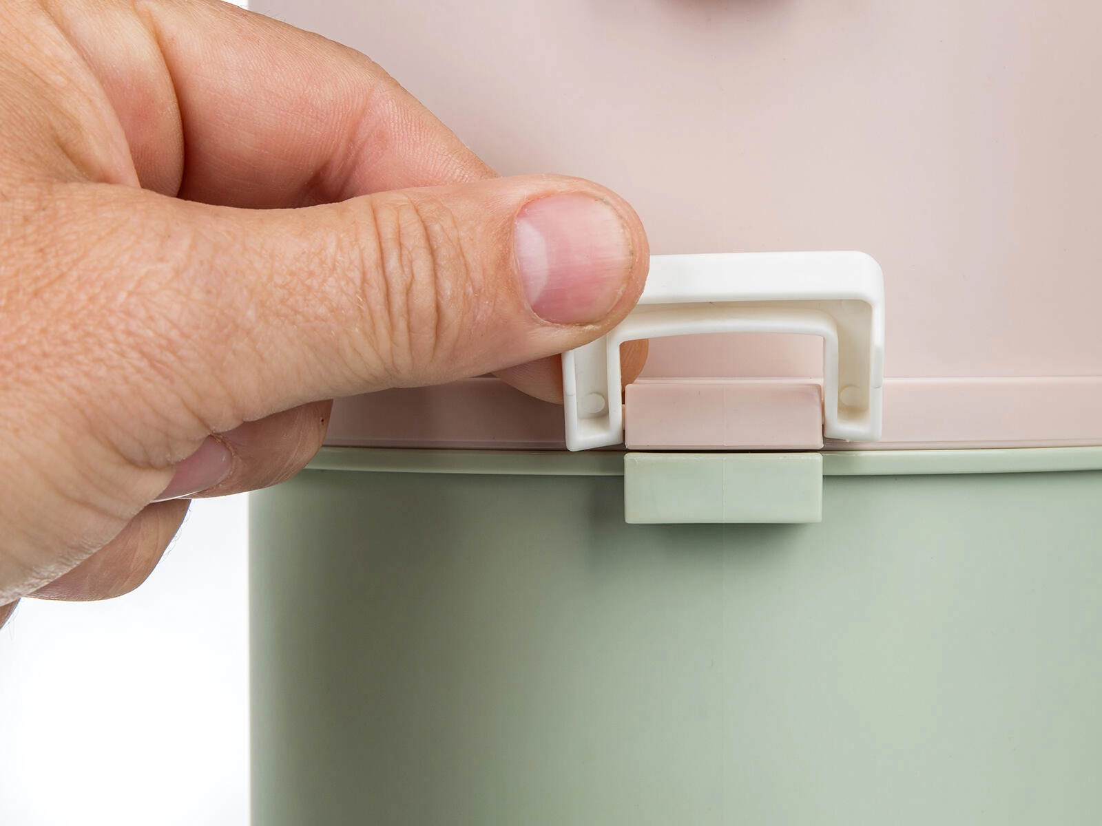 Zgornji pokrov z vzdržljivim ročajem in stranskimi zaponkami drži nadstropja trdno skupaj, zato se posoda za prenos hrane enostavno in varno prenaša.