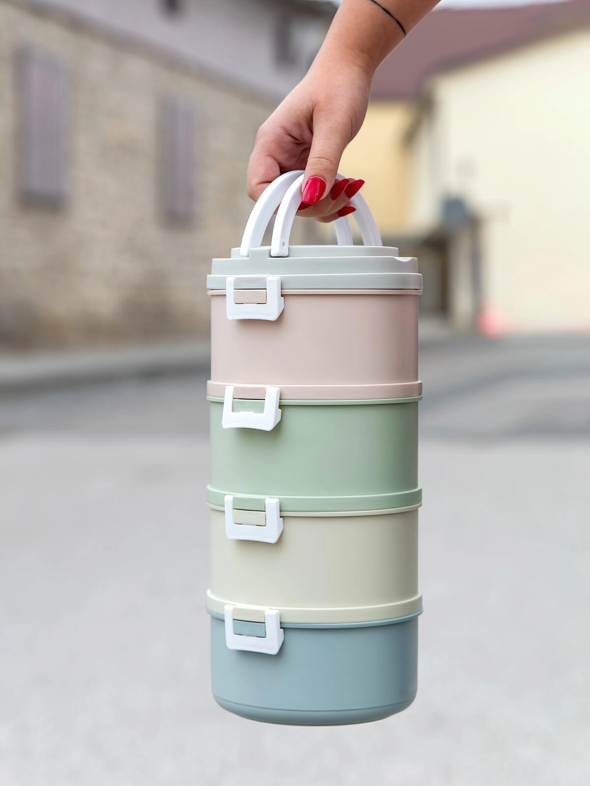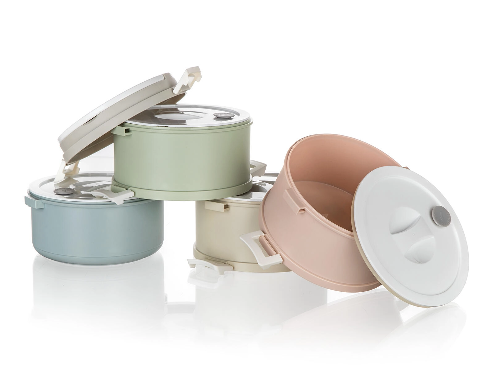 Modularna zasnova omogoča poljubno zlaganje in ločevanje nadstropij glede na potrebe. Trpežna plastika je primerna za vsakodnevno uporabo, posodice pa je mogoče uporabljati posamezno v hladilniku, zamrzovalniku in za segrevanje v mikrovalovni pečici. Enostavno vzdrževanje zagotavlja možnost pranja v pomivalnem stroju.
