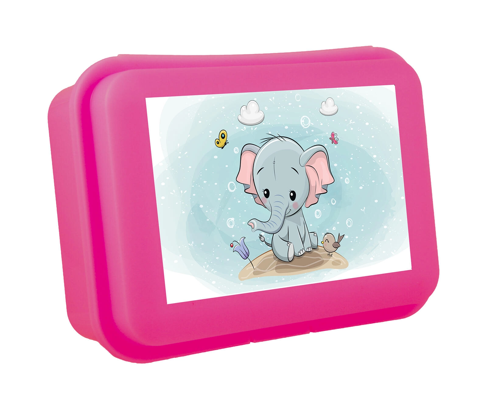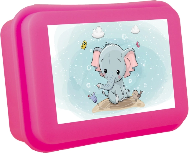 Praktična škatla za malico iz trpežne plastike z ljubkim motivom slončka in zanesljivim klik zapiralom. Idealna za malico v šolo, vrtec ali na pot. Kompaktne mere 16 × 11 × 5,5 cm in lahka zasnova v mešanici barv.